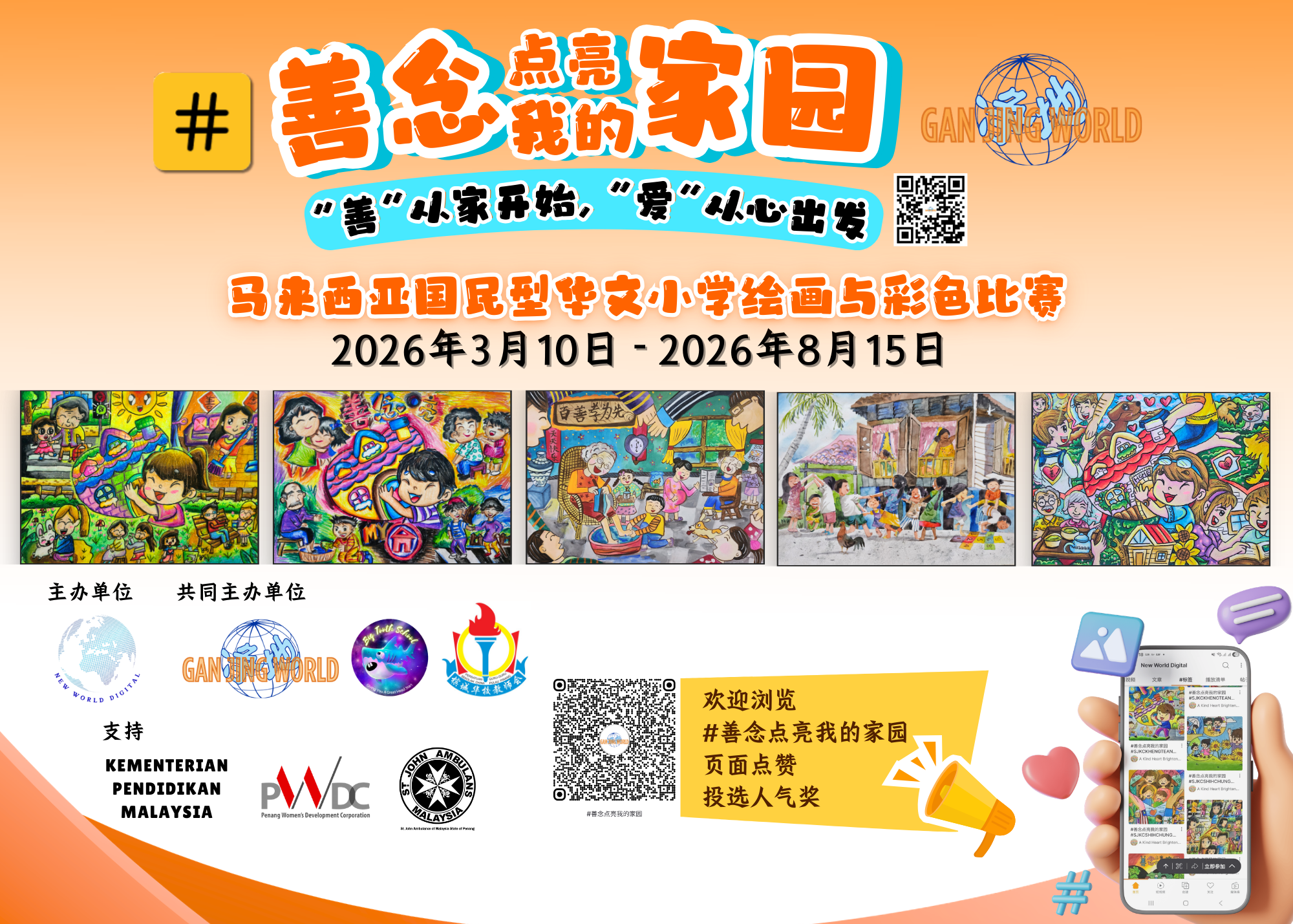 作品主题:家,是孩子成长的起点。在这里,孩子学会爱、学会理解与尊重、学会勇敢与成长。从小在家庭生活,每一 个善良的举动,每一句关爱的语言,每一份温暖的瞬间,都会在孩子心中种下善良 的种子,塑造孩子的品德与价值观。“善”从家开始,“爱”从心出发。小小的举 动,莫大的善举。参赛者依主题「善念点亮我的家园」手绘创作方式报名,用画笔传递温暖与力量。
